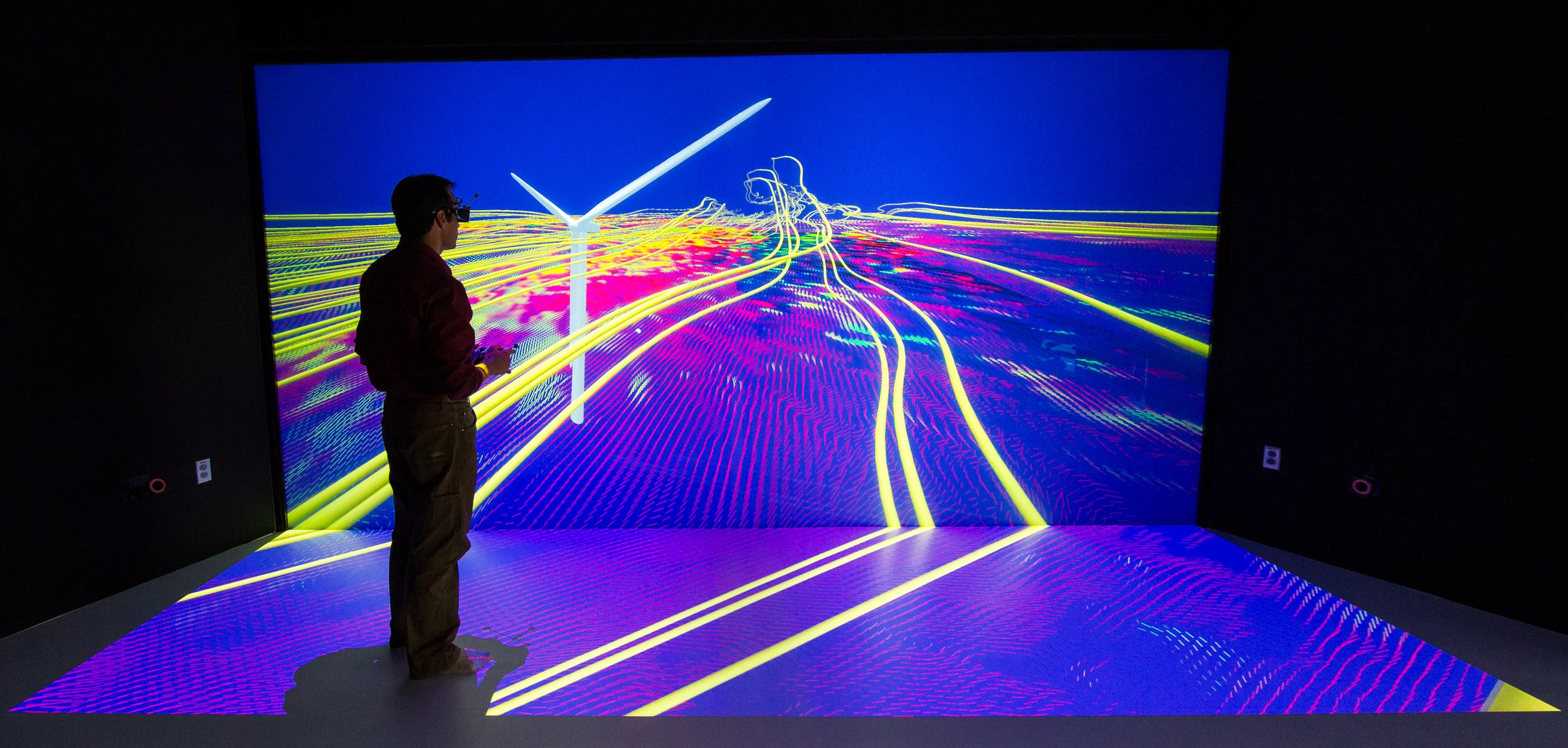 From there, we went to the Collaboration Room, which has six projectors that illuminate one wall and the floor. In this room, researchers are able to experience in real time the testing and simulation of equipment and technologies ranging from molecular structures to wind turbines. Wearing 3D glasses, we were able to move around in the turbulent wakes of a multi-turbine array and see firsthand how the placement of multiple wind turbines in relation to each other affects their functionality.